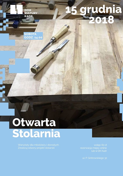 Warsztaty dla młodzieży i dorosłych. Jeżeli lubisz majsterkować, ale nie masz gdzie, jeżeli chcesz sprawdzić, czy stolarka to coś dla Ciebie, jeżeli masz pomysł na zrobienie czegoś z drewna, ale nie wiesz do końca jak, to przyjdź do naszej stolarni. Możesz u nas ciekawie i twórczo spędzić czas, możesz piłować, wiercić i szlifować. Możesz poznać tajniki tradycyjnego stolarstwa. W ramach Otwartej Stolarni będzie można skorzystać z przestrzeni i narzędzi znajdujących się w stolarni/majsterni, by zrelaksować swój projekt stolarski, na przykład prosty mebel czy odnowić stare krzesło lub stolik. Jeśli masz własny pomysł, ale nie wiesz jak go zrealizować zapraszamy do Otwartej Stolarni, z naszą pomocą i radą z pewnością, uda się go zrealizować.